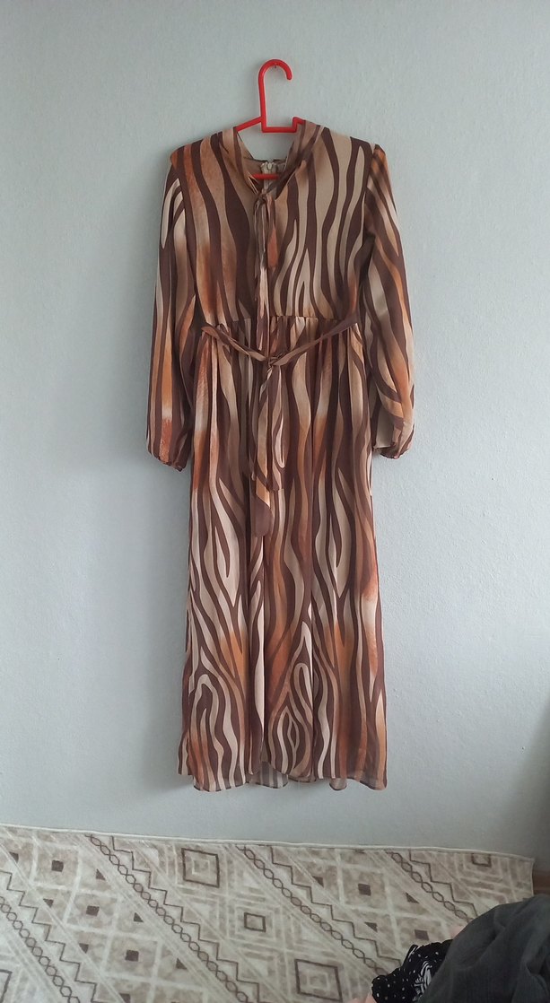 Parlak zebra desenli, drapeli, bol kesim kahverengi uzun elbise. Yüksek yakalı ve askılı kolludur, sentetik kumaştan üretilmiştir. iki koltuk arası 46 uzunluğu Bir kırk