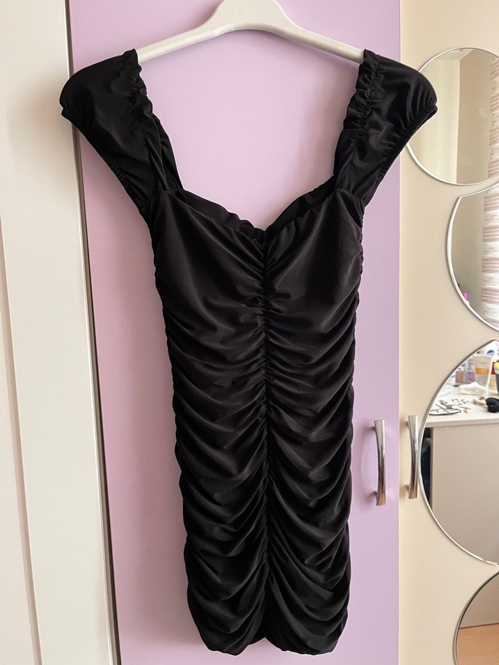 Drapeli tasarıma sahip, kalp yakalı ve askılı kollu siyah, gövdeyi saran mini abiye elbise. Cesur gotik tarz için uygun.