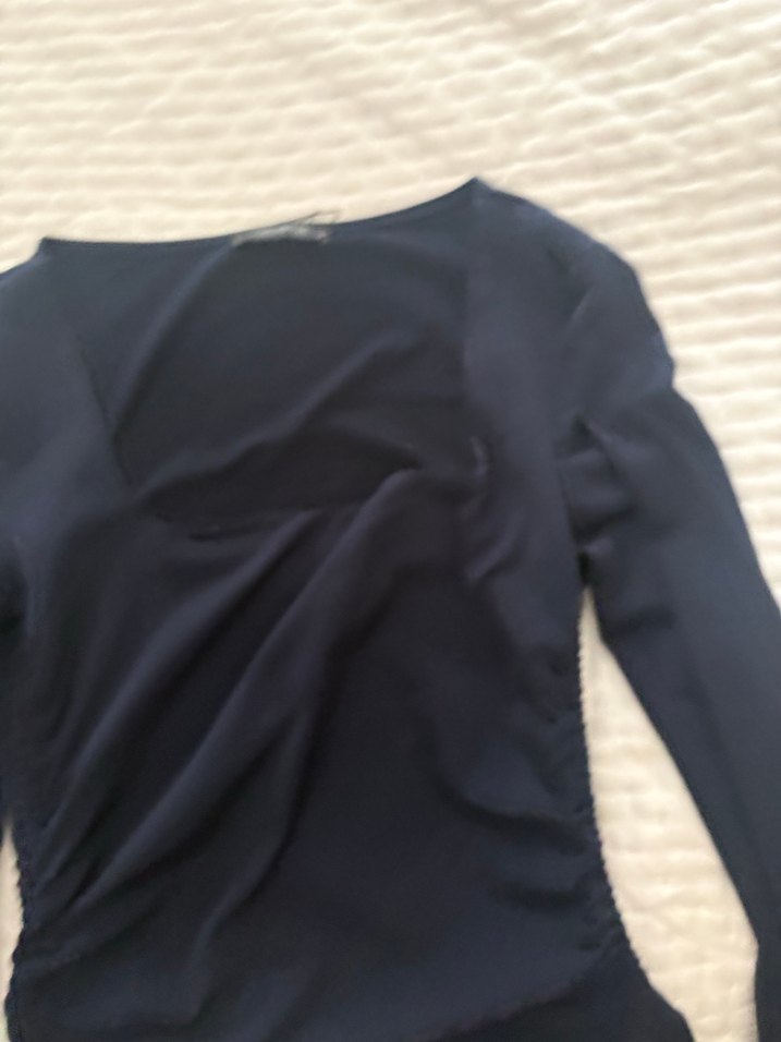 Drapeli tasarıma sahip,kare yakalı ve uzun kollu, lacivert kadın bluz. Sentetik dokusu ve şık kesimiyle ofis ve sokak tarzına uyum sağlar.