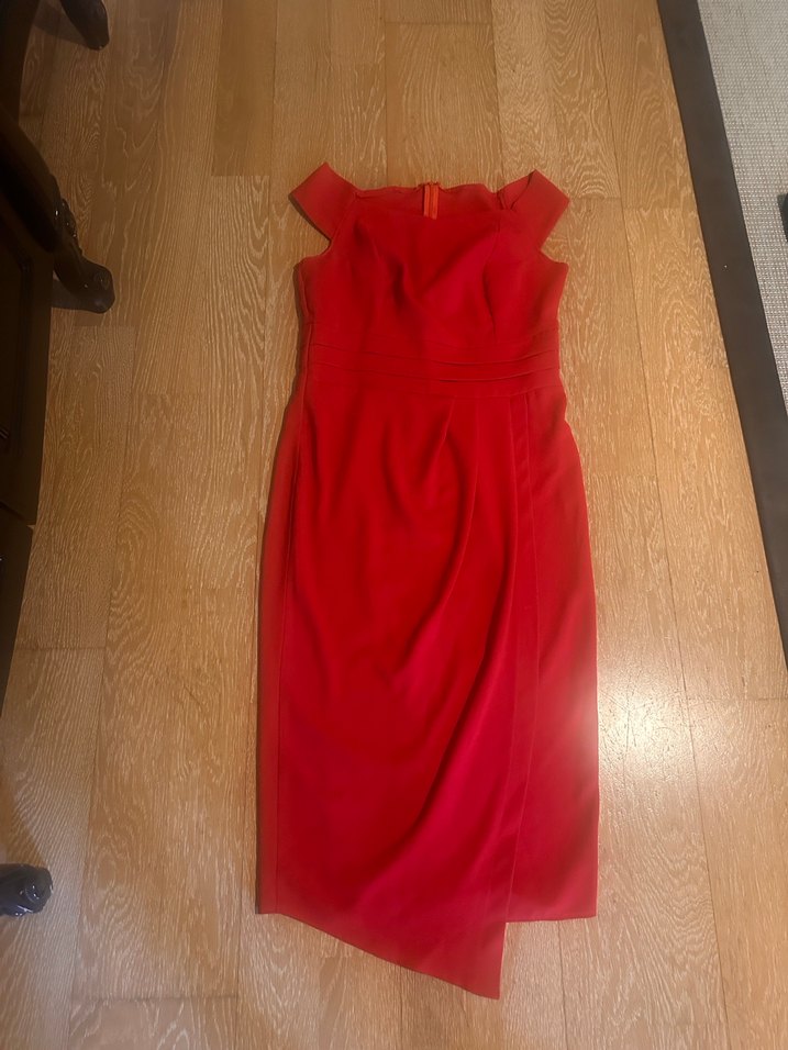 kırmızı kumaştan, drapeli, kayık yakalı, ve vücuda oturan abiye elbise, romantik akşamlar için uygundur. Bir kez giyildi m l kruvaze