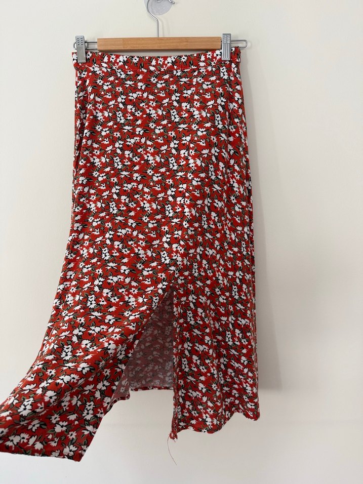 Drapeli, renkli kırmızı bağlama desenli ve yumuşak sentetik kumaştan yapılmış, vücuda oturan midi etek. Bohem ve retro tarzlara uygundur.