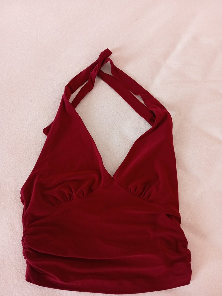 Kolsuz, vücuda oturan kırmızı mayo üstü, drapeli tasarıma sahiptir. Midi boyda, minimalist ve sokak stiliyle günlük kullanıma uygundur.