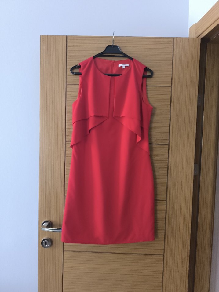 Parlak kırmızı renkte, drapeli detaylı, V yakalı kolsuz ve oturan midi elbise. Modern klasik tarzda ofis için uygun.