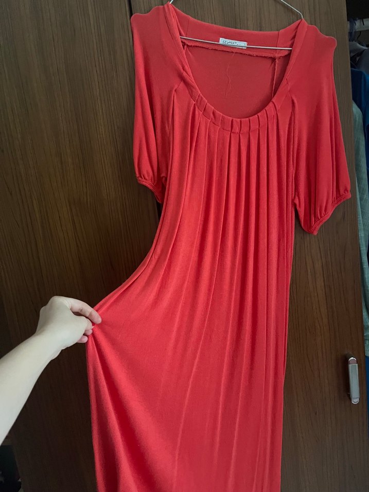 Parlak kırmızı, ipeksi kumaştan, V yakalı ve kısa kollu, bol kesim hamile elbisesi. Drapeli tasarımı ve midi boyu günlük kullanım için uygundur.