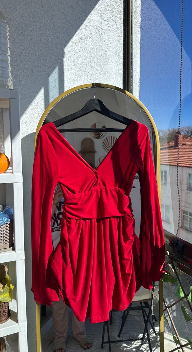 Parlak kırmızı, saten görünümlü kumaştan yapılmış, V yakalı ve uzun kollu, drapeli, bohem tarzda, vücuda oturan midi hamile abiye elbise. Romantik akşamlar için ideal.