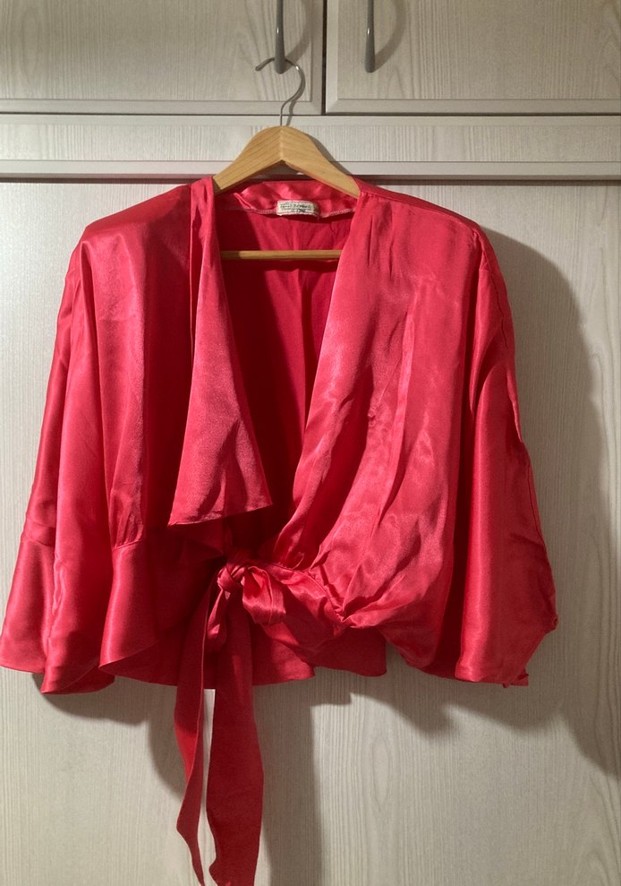 Kırmızı, ipeksi kumaştan, drapeli mini bluz. Askılı ve salaş kesim, bohem ve retro tarzlar için uygun.