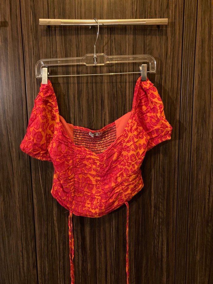 Parlak kırmızı tie-dye desenli, drapeli ve askılı kısa bohem tarzı mini bluz. Straplez kesimi romantik akşamlar için uygundur. ❤️