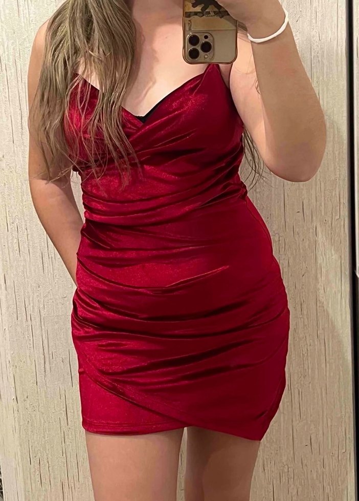 Drapeli ve V yakalı kırmızı mini elbise, ince askılarla ve parlak ipeksi kumaştan. Sokak tarzını yansıtan gösterişli bir parça, romantik akşamlar için uygun.