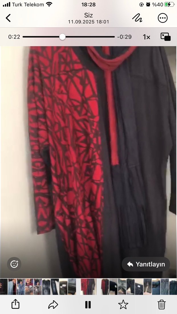 Kırmızı siyah baskılı, uzun kollu ve V yakalı, drapeli, bol kesim uzun elbise. Yumuşak sentetik kumaştan üretilmiştir.