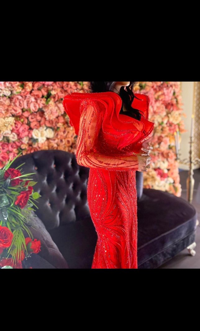 Drapeli detaylara sahip, straplez yakalı, fitted kırmızı uzun abiye elbise, gösterişli düğünler için cesur ve desenli tarzda.