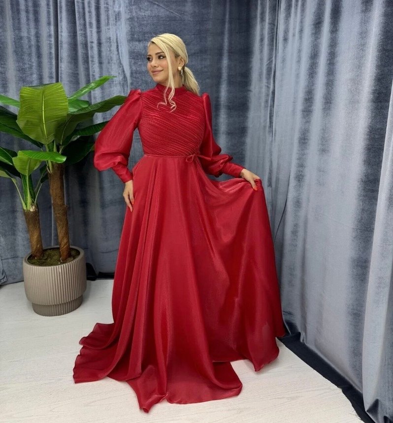 Parlak kırmızı kumaştan, yüksek yakalı ve uzun kollu, drapeli detaylara sahip bol kesim uzun abiye elbise. Düğünler için ideal. ✨