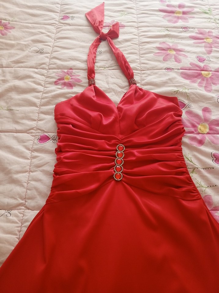 Kırmızı, drapeli ve straplez yakalı bu uzun elbise, şık bir halka detayına sahip, parti için uygundur. ✨