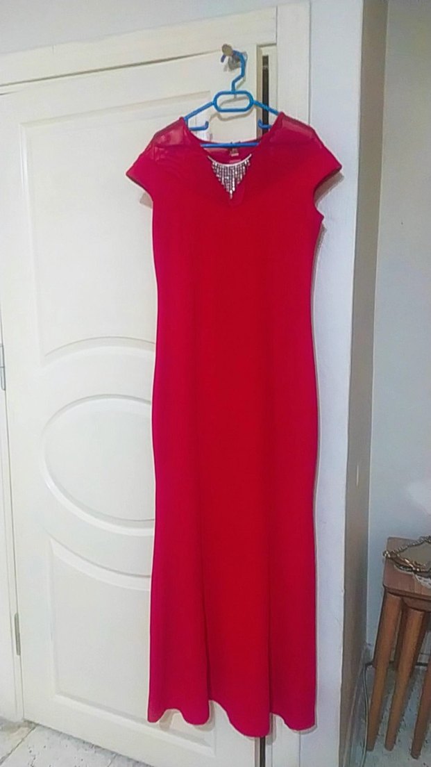 Kırmızı renkte, V yakalı ve drapeli detaylara sahip, uzun ve kolsuz, klasik modern tarzda abiye elbise. Düğünler için uygun. l beden ama esnek kumaş xl rahat olur