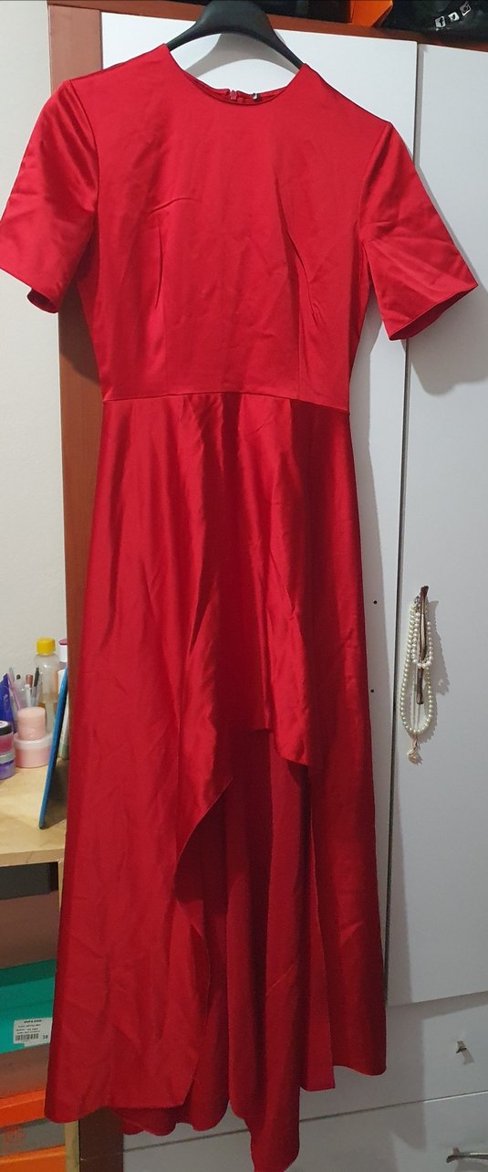 V yaka, kısa kollu, drapeli kırmızı uzun abiye elbise, parlak kumaştan ve şık kesimlidir. Düğünler için uygundur.