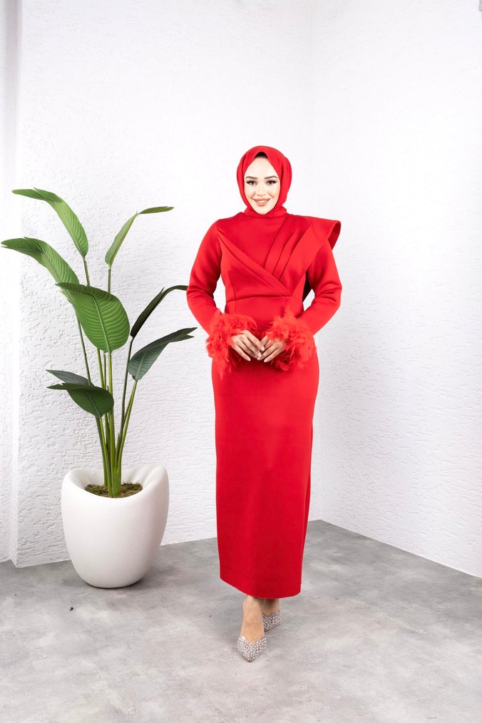 Yüksek yakalı, uzun kollu ve tüy detaylı kırmızı abiye elbise, drapeli tasarımıyla sade ve modern bir görünüm sunar.