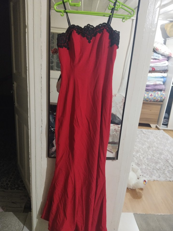 Uzun, dar kesim kırmızı straplez gece elbisesi, siyah dantel detaylı. Kolsuz ve drapeli tasarım, romantik akşamlar için uygun. Gotik şıklık.