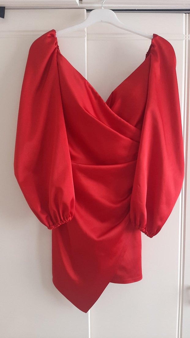 Drapeli V yakalı, uzun balon kollu, parlak kırmızı midi elbise. Cesur ve şık görünüm için uygundur. ❤️