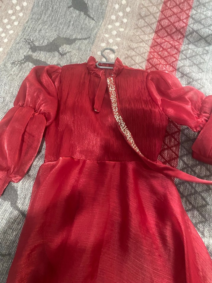 Drapeli, uzun ve fitted kesim kadın elbisesi. Yüksek yakalı, uzun kollu, parlak kırmızı kumaş üzerine nakışlı, vintage ve bohem tarzında, düğün için uygun. ✨bordo şal dahil 38-44 beden arası olur