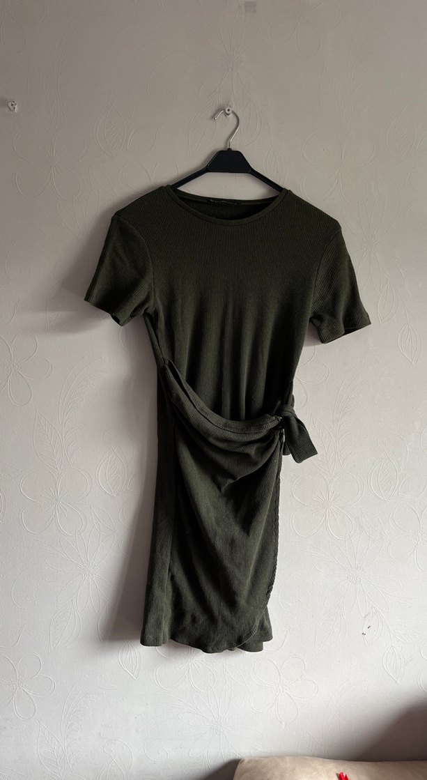 Kısa kollu, bisiklet yaka ve drapeli detaylı, rahat yapılmış, vücuda oturan midi uzunlukta haki elbise. Minimalist tarzda günlük kullanıma uygun.
