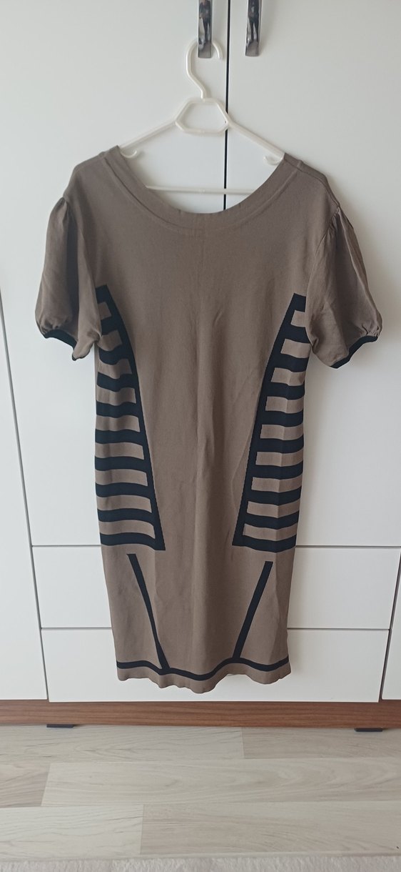 Kısa kollu, yakalı ve drapeli tasarıma sahip, bej ve gri tonlarda baskılı, sentetik kumaştan yapılmış, günlük kullanıma uygun dar kesim midi elbise.