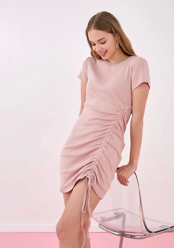 Kısa kollu, bisiklet yaka, yumuşak sentetik kumaştan yapılmış, vücuda oturan mini elbise. Yan tarafı drapeli ve büzgülü, pastel pembe renkte, romantik buluşmalar için ideal.