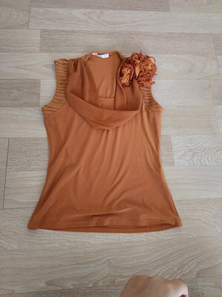 Kolsuz, drapeli yuvarlak yakalı, kısa ve dar kesim bej bluz, yumuşak sentetik kumaştan. Trendy günlük stil için uygundur.