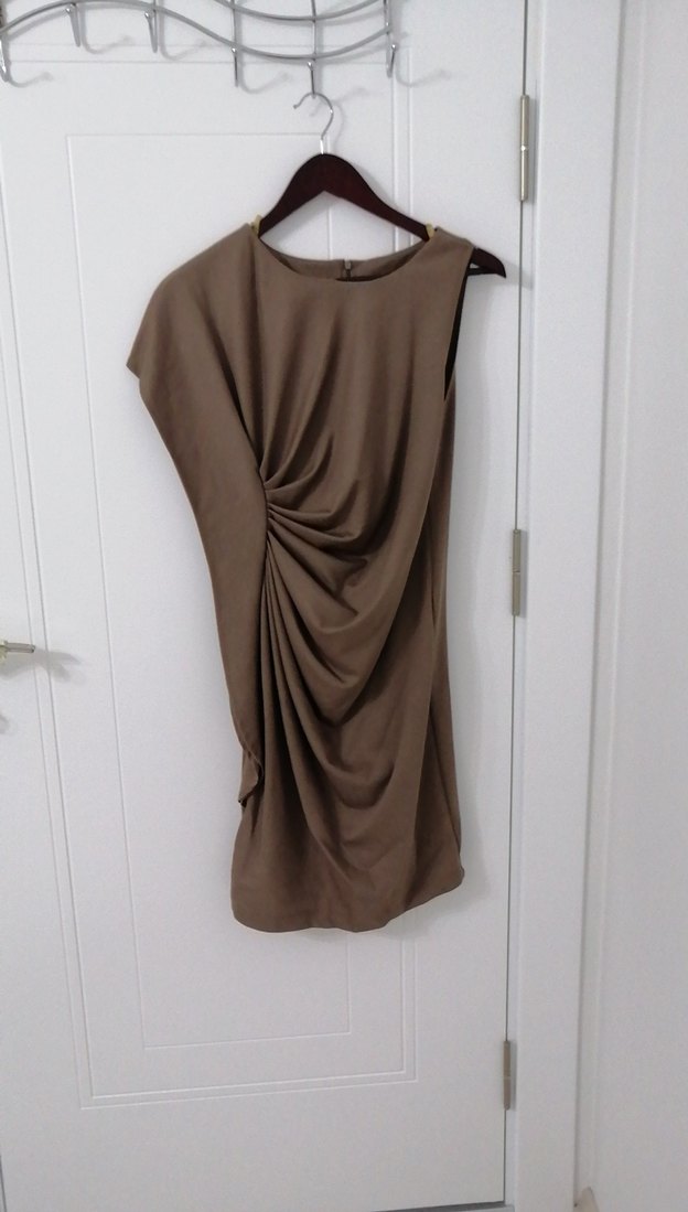 Kolsuz bej Muhteşem güzel bir tasarıma sahip elbise, drapeli detaylı , yuvarlak yakalı, çağdaş ve minimalist tarzda her ortamda şıklık yaratacak bir elbise.. Bir tarafı tamamen kolsuz diğer tarafında omuzdan inen bir tasarımı var.. Öndeki drapeler göbeği saklayan aynı zamanda da fark yaratan bir stile sahip..