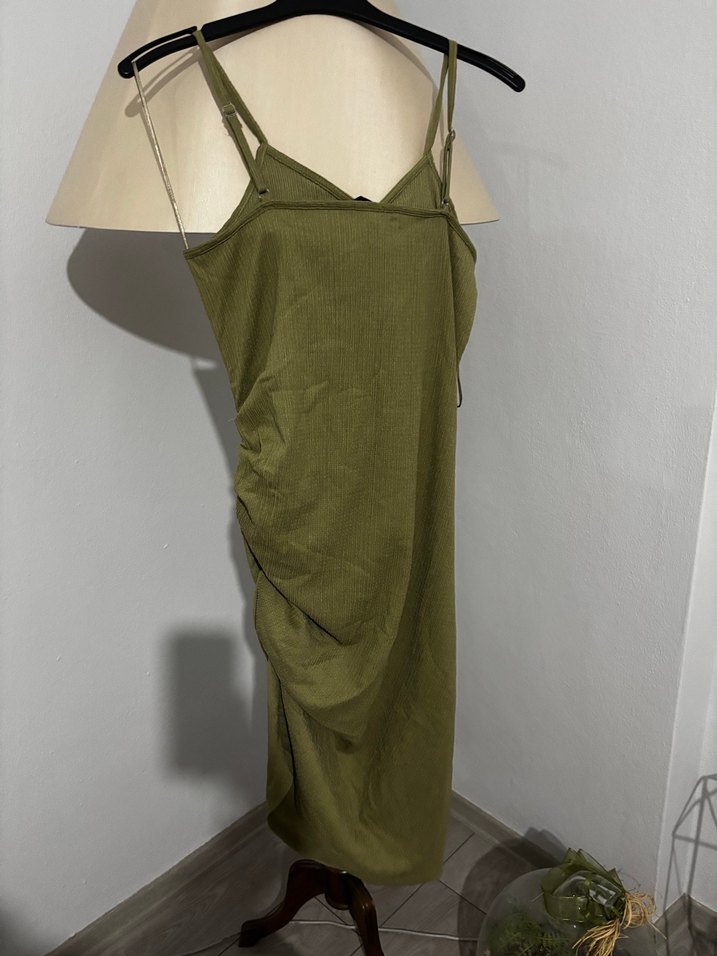 Kolsuz, drapeli ve straplez yakalı haki renk hamile elbisesi. Keten kumaştan, minimalist ve şık sokak stili, günlük kullanım için uygun.