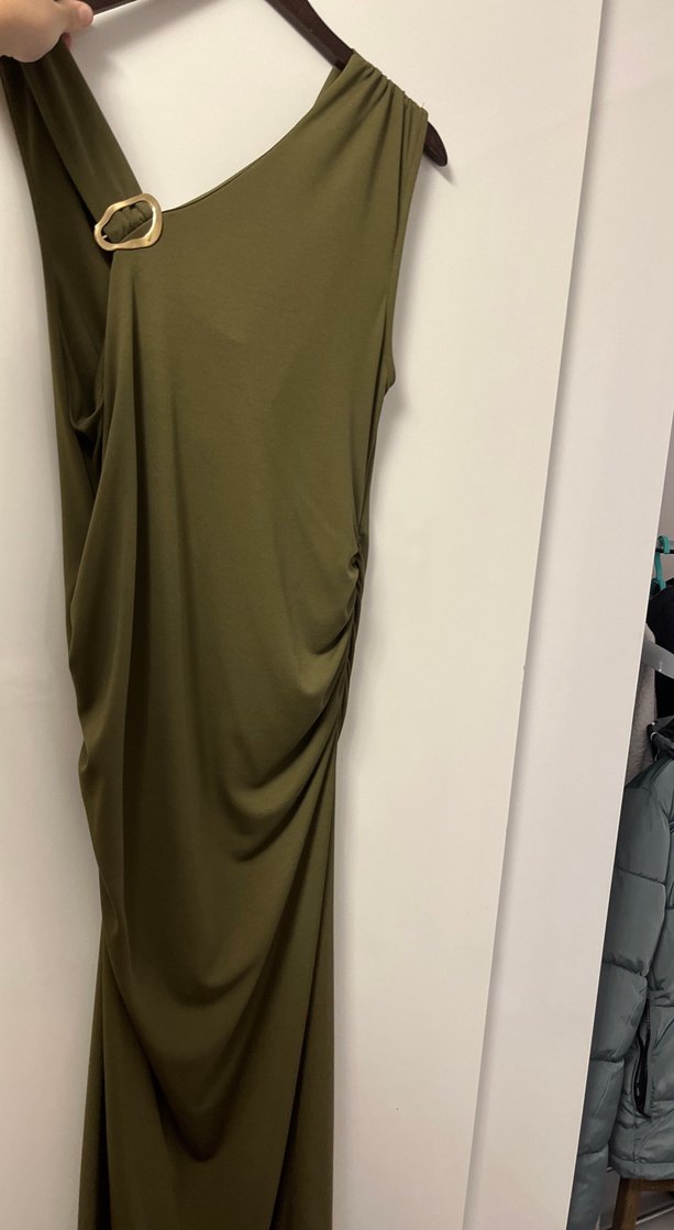 Kolsuz, V yakalı, drapeli haki uzun elbise. Yumuşak sentetik kumaştan, rahat ve minimalist tarzda günlük kullanım için uygundur.