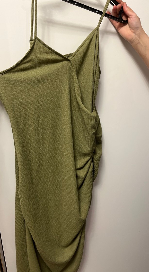 Keten kumaştan, kolsuz, straplez, drapeli, fitted kesim midi elbise. Sokak stili için uygun, haki renkte.