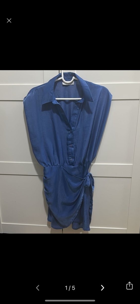 Koyu mavi renkte, yakalı ve kolsuz elbise. Drapeli detaylı, düğmeli ve fitted kesim.