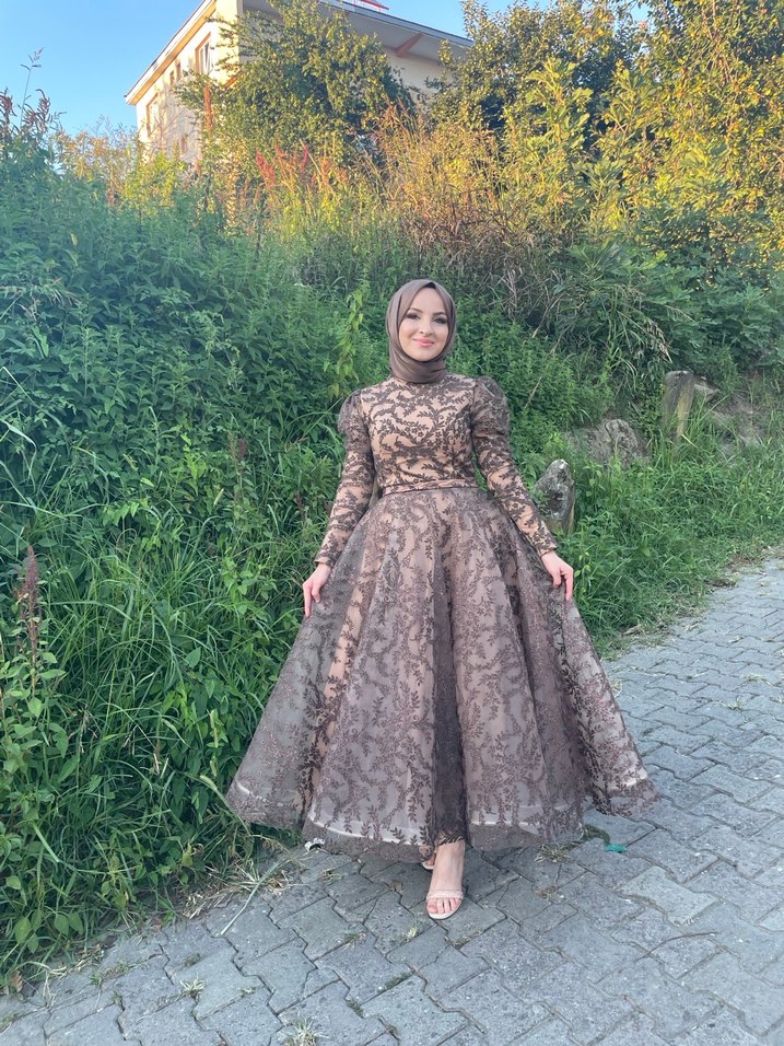 Drapeli kumaştan, koyu kahverengi etnik desenli, uzun kollu ve yüksek yakalı, fitted kesim abiye elbisedir. Düğün için uygundur.