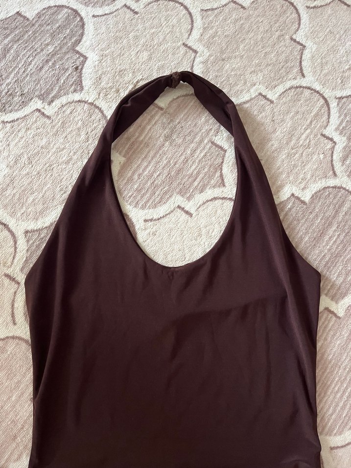 Drapeli, yüksek yakalı, koyu kahverengi, sentetik kumaştan yapılmış, vücuda oturan kadın atlet.