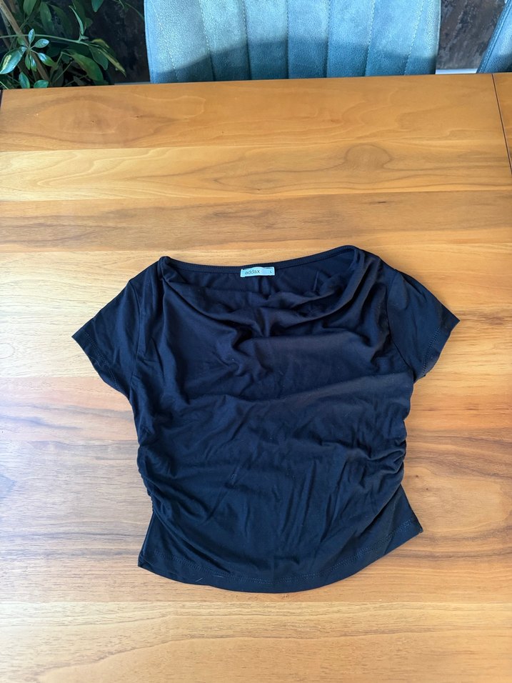 Drapeli, kayık yaka, kısa kollu hamile bluzu. Yumuşak keten kumaştan, normal midi boyda, günlük sokak giyimi için uygun.