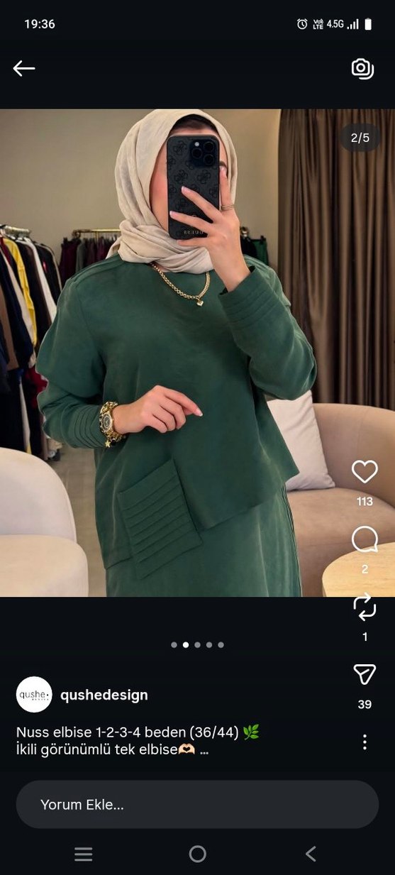 Koyu yeşil renkte, uzun kollu ve yuvarlak yakalı, bol kesim kadın tunik. Yumuşak ve sıcak kumaştan, drapeli detaylı, günlük kullanıma uygun sade ve rahat tarzda. elbisedir nuss markasına aittir 1 kez giyildi yepyenidir