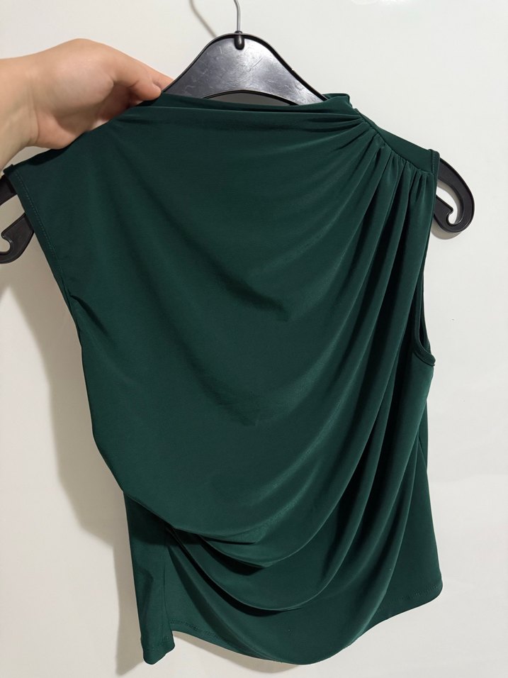 Drapeli, kolsuz, yüksek yakalı koyu yeşil kadın bluz. Sentetik, yumuşak kumaştan, ofis ve avangard sokak stiline uygun.