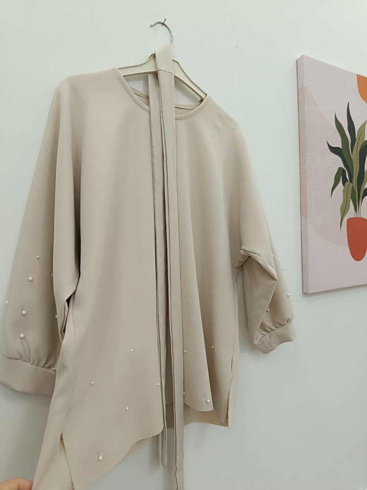 Krem renkli kadın tunik, yuvarlak yakalıdır. Drapeli tasarımı ve bol kesimiyle minimalist, çağdaş bir görünüm sunar. Uzun boyu ve düz dokusu günlük kullanıma uygundur. ✨ Bir kaç incisi eksik