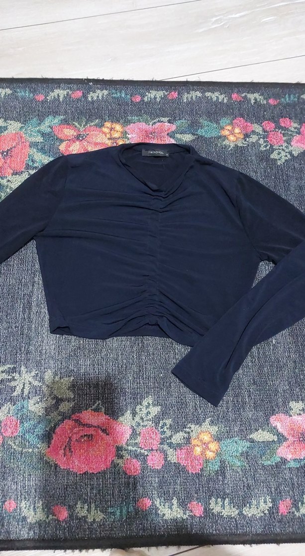 Drapeli tasarıma sahip, uzun kollu ve yüksek yakalı lacivert kadın bluz. Yumuşak sentetik kumaştan, günlük kullanıma uygun normal uzunlukta.