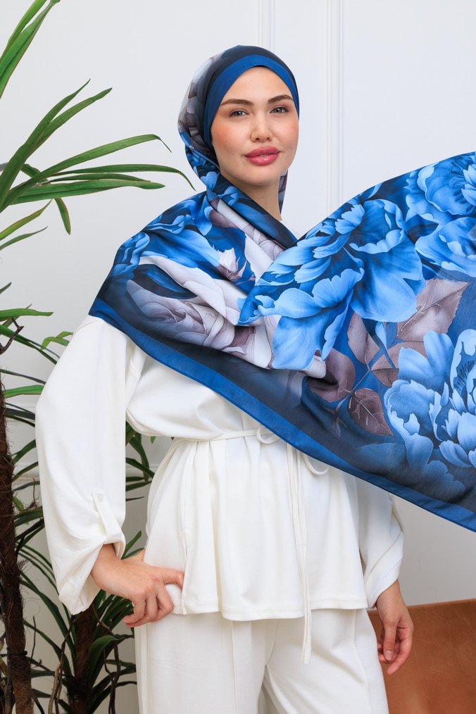 Drapeli, koyu mavi renkte, sentetik kumaştan kadın şalı. Çağdaş bohem stilini yansıtır, mütevazı giyim için uygundur.