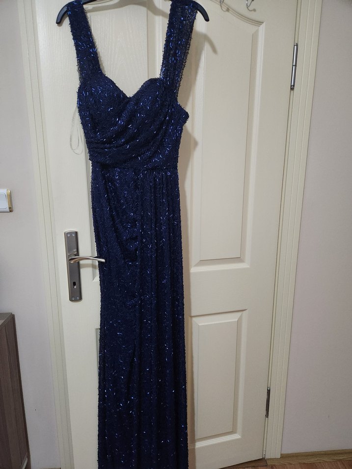 Lacivert, drapeli, uzun ve vücuda oturan kadın abiye elbisesi. Askılı ve straplez tasarımı ile düğün ve özel davetler için uygundur.