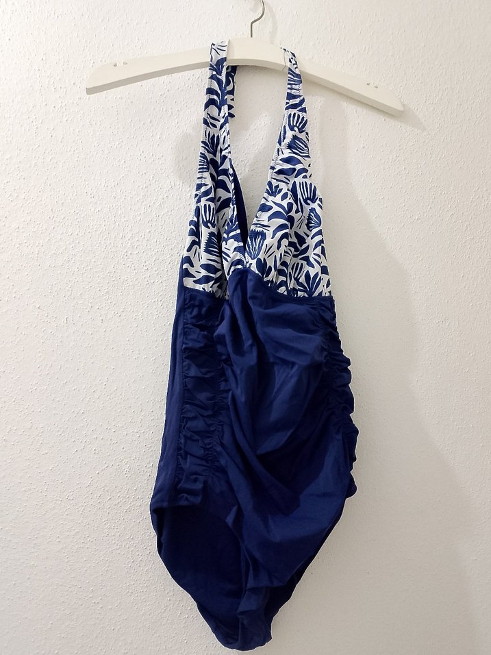 Drapeli, kolsuz, lacivert mavi bağlamalı mayo, normal uzunlukta ve vücuda oturan kesime sahiptir.