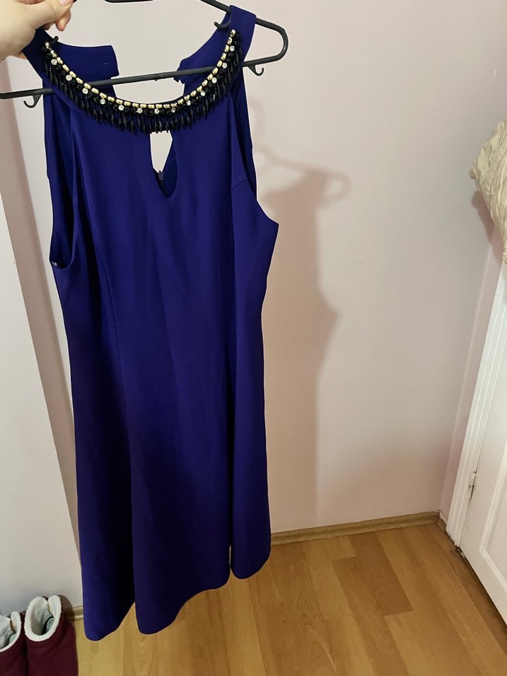 Lacivert, kolsuz midi elbise, V yakalı ve drapeli tasarıma sahiptir. Yakası boncuk detaylı ve parlak kumaştan yapılmıştır. Romantik akşamlar için uygundur. etiketi üstünde hiç giyilmedi