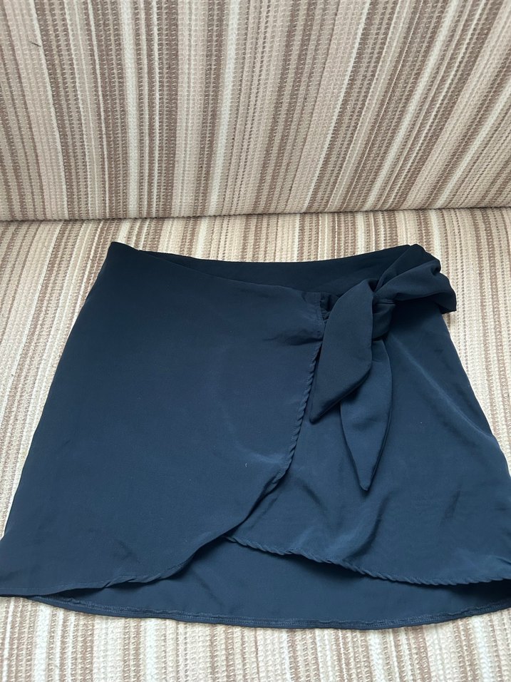 Lacivert midi boy drapeli etek, yan bağcık detayı ve düz kesimiyle romantik akşamlar için uygun.
