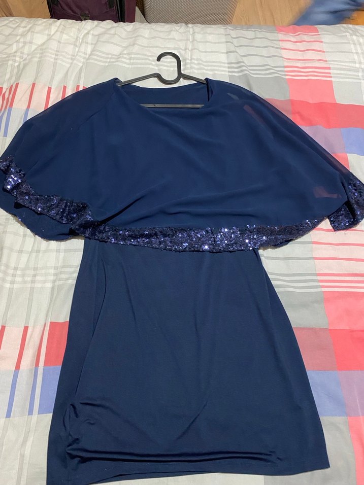 Lacivert, drapeli ve kısa kollu bu midi elbise, yuvarlak yakalı ve dar kesimdir. Payet detaylı, desen içermeyen kumaşıyla parti için uygundur.✨