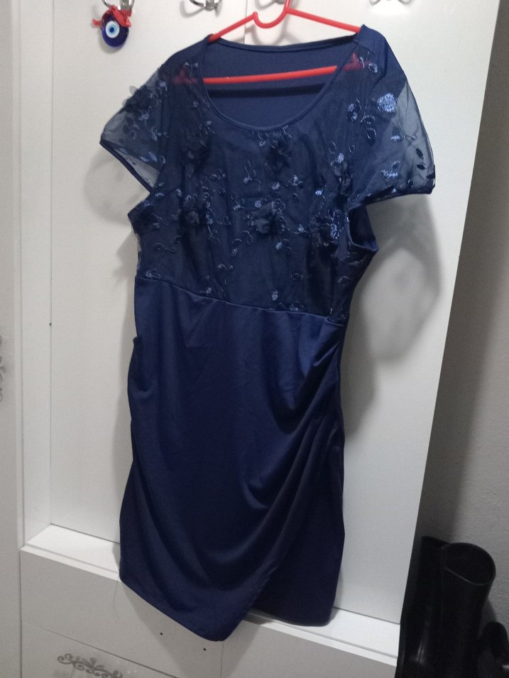 Lacivert, V yaka, kısa kollu, drapeli ve işlemeli detaylara sahip, minimal gotik tarzda, düğünlere uygun, vücuda oturan midi elbise.