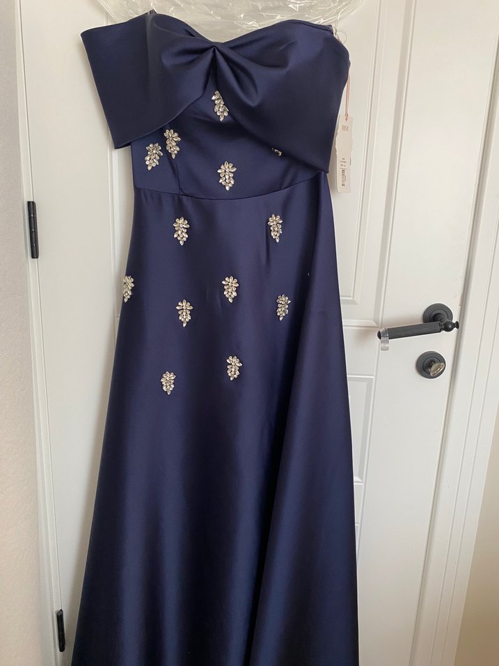 Drapeli detaylı, taş işlemeli lacivert straplez abiye elbise, uzun boy ve ince kesimle modern klasik şıklık sunar. Etiketli ürün