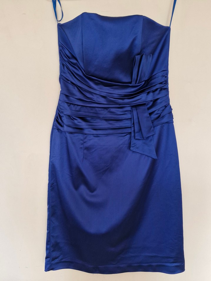 Lacivert, straplez yakalı, drapeli, saten kumaştan, midi boy ve kolsuz, klasik ve minimal tasarımlı abiye elbise.
