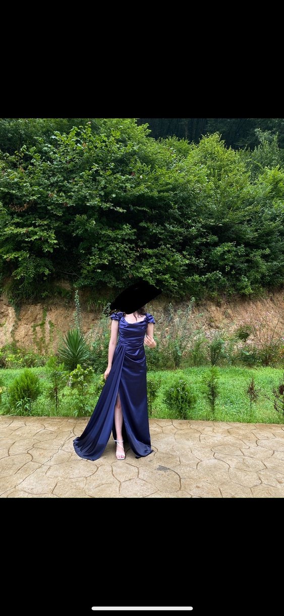 Drapeli, straplez ve askılı kol detaylı, uzun lacivert parlak kumaşlı, fit kesim kadın elbisesi. Gotik ve avangart tarzda, düğün için uygun. Ürün dar kalıp normalde 36-38 beden giyiniyorum