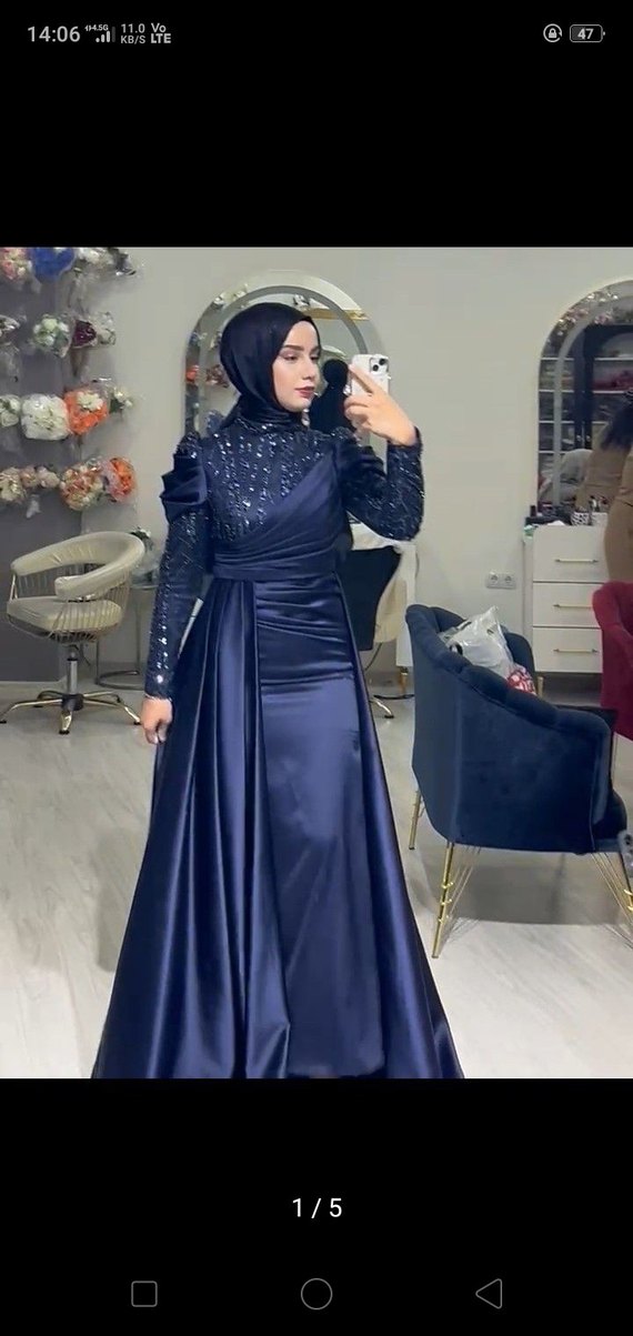 Lacivert, parlak desenli uzun kollu ve yüksek yakalı üst kısmı, drapeli ve regular fit etekle tamamlanan bu uzun abiye elbise, düğünler için uygundur. ✨