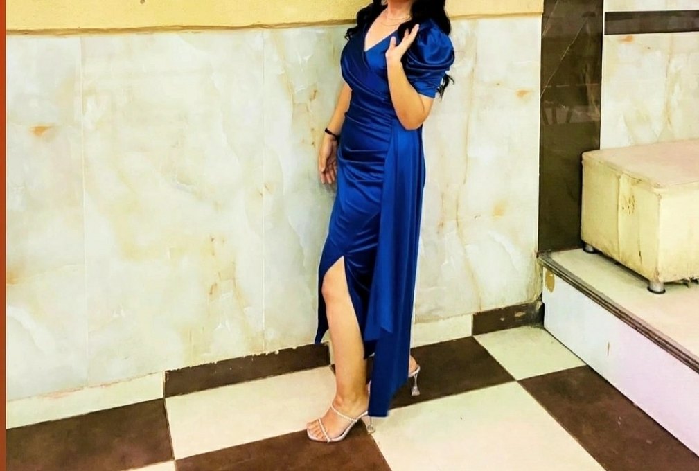 Lacivert, drapeli, V yaka ve askılı kollu, parlak kumaşlı uzun ve vücuda oturan abiye elbise. Romantik akşamlar için uygun. ✨